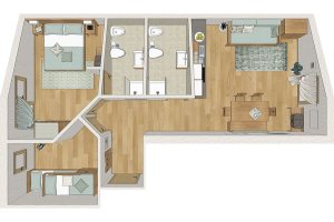 Le famiglie numerose o che desiderano ambienti separati per un maggiore comfort, possono scegliere due camere comunicanti con bagno.