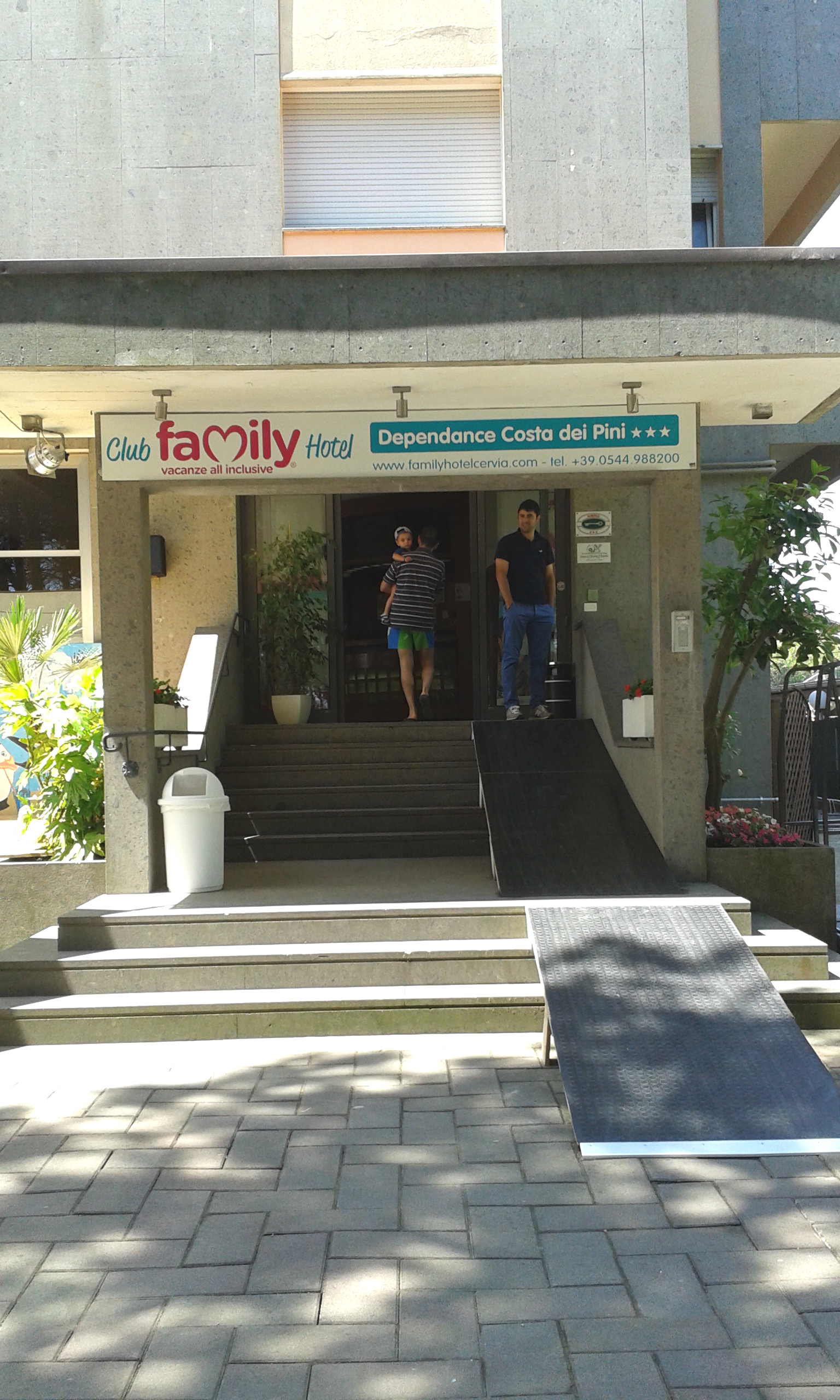 Quest'altro albergo si trova piuttosto lontano sia dal centro che dal mare (700 metri), tanto che c'è un trenino che porta alla spiaggia. L’ingresso ha una ripida rampa di scale, ma i carrozzati possono passare dal deposito bici che si trova a bordo strada, e attraverso cui si accede all’area giochi e ristorante.